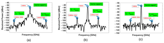 Frequency domain measurements at a 1 cm distance between the implanted antenna and the interrogator. The sideband signal is at (a) 100 Hz, (b) 1 kHz, and (c) 5 kHz fneuro.