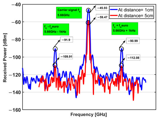 Based on Equation (7), the path loss at 1 and 5 cm will be 8 dB and 22 dB, respectively. Figure 10 illustrates the received power at the carrier frequency (5.66 GHz) and the sideband frequencies [5.66 GHz ± fneuro (1 kHz)]. The received carrier power decreased by 13 dB when the distance between the interrogator and the sensor was increased from 1 cm to 5 cm. This matches with the expected additional loss of 14 dB from Equation (7). However, the reduction in the received power at the sideband frequencies was 19–21 dB.