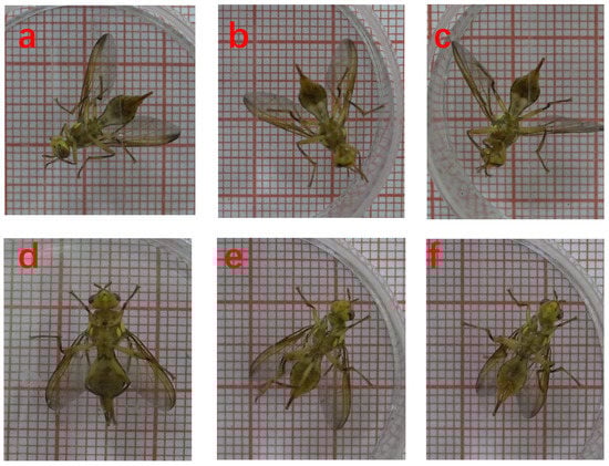 - Huang, X.Q.; Zheng-Yue, L.I.; Chuan-Ren, L.I.; Boiteau, G.; Gui, L.Y. Wing loading and extra loading capacity of adults of the Chinese citrus fruit fly, Bactrocera(Tetradacus) minax (Diptera:Tephritidae). Acta Entomol. Sin. 2012, 55, 606–611. [Google Scholar]