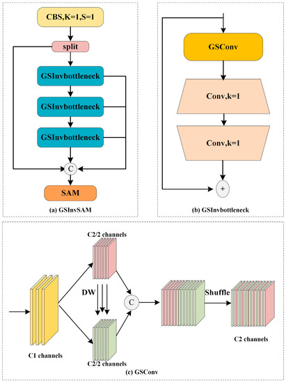 The structure of the (a) GSInvSAM, (b) GSInvbottleneck, and (c) GSConv.