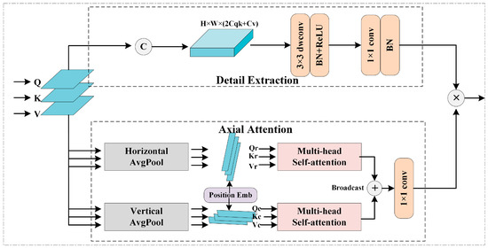 Detail Extraction. To compensate for the local details lost when global extraction is performed by axis attention, we designed the Detail Extraction branch to capture and preserve local information. As shown in Figure 4, the Q, K, V tensor is stitched in the channel dimension, and local features are extracted by a small kernel depth separable convolution of 3 × 3. Then, the point convolution with kernel 1 and the corresponding normalization and activation operations are used to reduce the channel dimension to C. Finally, the Detail Extraction branch and Axial Attention branch are fused in a multiplicative manner to achieve a mutual complement of global and local information.
