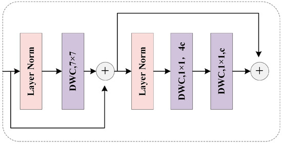 Large Kernel Region-aware Module. The larger receptive field is the reason why window attention has an advantage over ordinary convolution. However, the operation of self-attention in the whole window inevitably introduces a large amount of calculation. Inspired by large kernel convolution and depth convolution, this paper argues that large kernel depth convolution can provide a larger receptive field similar to window self-attention, while greatly reducing computational costs. Therefore, we use a large kernel (e.g., 7 × 7)-based depthwise convolution to extract region information. In addition, we use a depthwise convolution scaling with a kernel of 1 to perform dilation and compression operations on each channel to minimize the information redundancy between channels. In the whole module, two consecutive residual connections are used to ensure the stability of the gradient, and the Batch Norm (BN) commonly used in convolution is replaced with Layer Norm (LN) to avoid the problem of weak model generalization caused by BN.