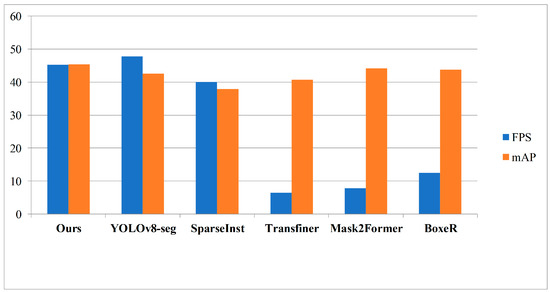Furthermore, the YOLO family has recently introduced the YOLO-seg [15,16] series specifically designed for real-time instance segmentation tasks, which has yielded remarkable outcomes. Comparing our method to YOLOv5-seg [16] and YOLOv8-seg [15], we have achieved respective improvements of 5.3% and 2.8% in mask mAP, albeit with a corresponding decrease in speed of approximately 2.5 FPS. This reduction in speed can be attributed to the additional memory access required by the introduced sparse attention mechanism, which marginally affects the inference speed. Nevertheless, our model remains capable of ensuring real-time operation while preserving its overall segmentation performance. We consider this minor decrease in speed to be reasonable. Additionally, by examining the indicators of APS, APM, and APL in Table 1, our method exhibits varying degrees of enhancement compared to the baseline model of YOLOv8-seg. This observation indicates that ESAMask is capable of delivering satisfactory detection results for objects of diverse sizes.
