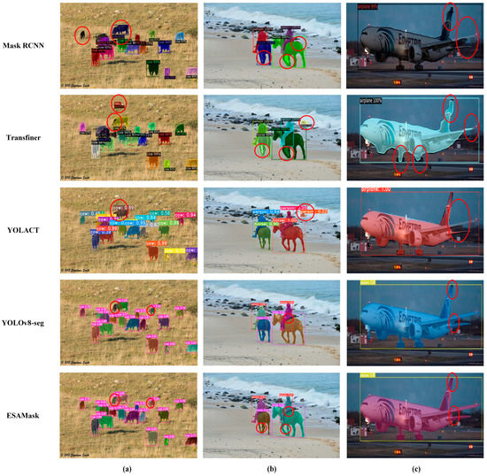 A visual comparison of ESAMask and other classical networks. (a) small targets; (b) medium targets; (c) large targets. The red circle represents a comparison of the detail part of the segmentation effect of different networks.
