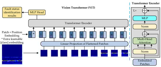 The structure of MLP consists mainly of a fully connected layer and an activation function. The output weights of the multi-headed self-attentive mechanism are received and compared to identify the fault types. The structure of the ViT model is shown in Figure 1.
