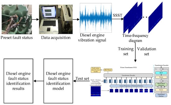 Therefore, this paper takes diesel engines as the engineering research background, and proposes a diesel engine status recognition method that combines the advantages of SSST to represent time-varying nonlinear non-smooth signals with the excellent image classification ability of ViT to achieve the classification of diesel engine fault status in response to the current problem of inaccurate diesel engine status recognition. The main contributions and innovations of this paper are as follows: