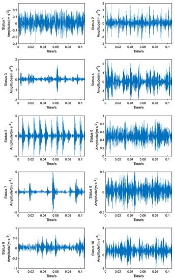 The time-domain analysis of the vibration signals in each status of the bearing was performed. The data length of each fault status was intercepted to 5120 sampling points, and the time-domain waveforms of the bearing in 10 statuses were obtained, as shown in Figure 3.