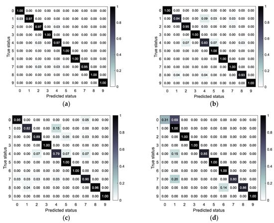 Confusion matrix for different fault status identification models: (a) SSST-ViT; (b) ST-ViT; (c) SSST-2DCNN; and (d) FFT spectrum-1DCNN.