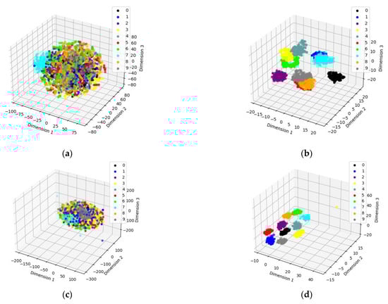 In order to test the feature extraction ability of the SSST-ViT method, the output of the classification layer network of the ViT model was extracted as the discriminative features, and the results of fault status recognition were visualized in three dimensions by the t-SNE nonlinear dimensionality reduction technique, which is suitable for visualizing high-dimensional data. The original data of the training set, the original data of the test set, the feature data of the training set and the feature data of the test set were obtained, as shown in Figure 15.