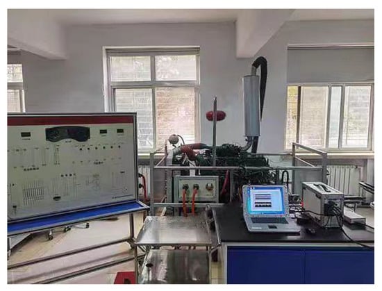 In order to verify the effectiveness of the SSST-ViT diesel engine fault status identification methods, this study relies on the high-pressure common rail diesel engine experimental bench in the laboratory, taking a CA6DF3-20E3 diesel engine as the research object to collect the state monitoring information during the operation of the diesel engine in different fault modes and provide data support for the research of diesel engine fault status identification methods. The experimental bench can be divided into two parts: the diesel engine system and the data acquisition system. The panoramic view of the experimental bench is shown in Figure 8, and the sensor installation is shown in Figure 9.