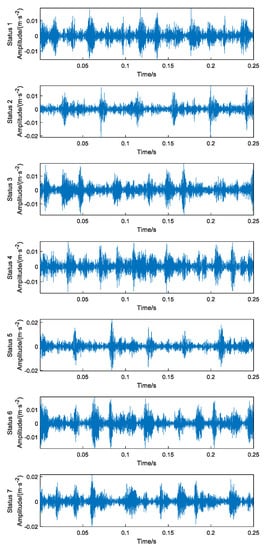 Due to the simplicity, intuitiveness and clear physical meaning of the time-domain signal, the time-domain analysis of the vibration signal in each status of the diesel engine was performed. The length of the data intercepted for each failure mode sample is 5000 sampling points, and the time-domain waveforms of the diesel engine in each status are obtained as shown in Figure 11.