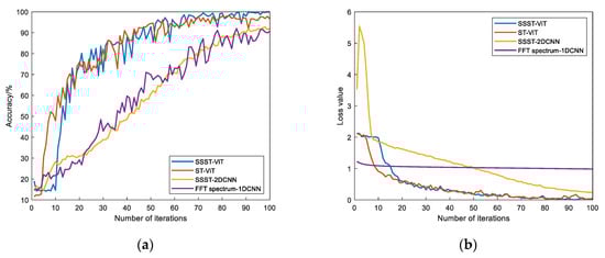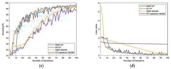 The training results of this model are compared with the training results of ST-ViT, SSST-2DCNN, and FFT spectrum-1DCNN models. The loss values and accuracy results of the training and validation sets of each model were obtained, as shown in Figure 5. The fault status identification results after 100 iterations are shown in Table 2 (Model 1: SSST-ViT; Model 2: ST-ViT; Model 3: SSST-2DCNN; Model 4: FFT spectrum-1DCNN).