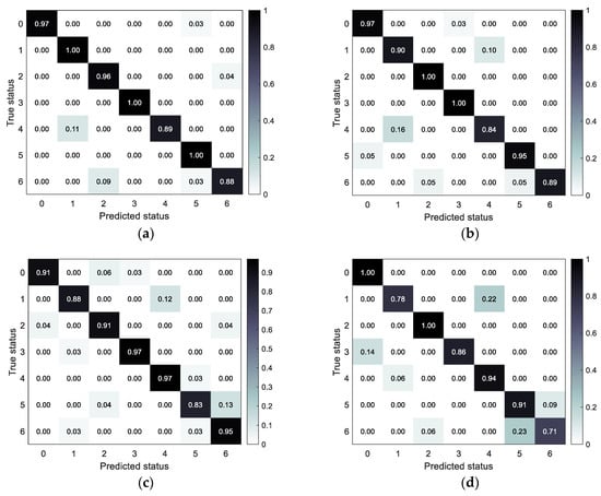 The performance of the models was evaluated under the test set, and the accuracy and confusion matrix of different fault status identification models were obtained as shown in Table 6 and Figure 14, respectively.