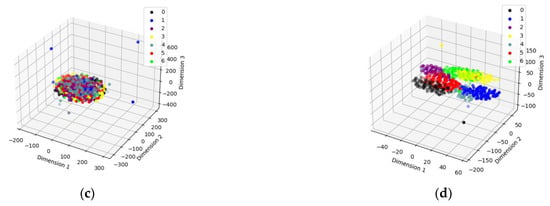 Three-dimensional visualization of status recognition results: (a) Training set raw data; (b) training set feature data; (c) test set raw data; and (d) test set feature data.