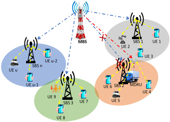 In a post-disaster scenario, Movable and Deployable Resource Units (MDRUs) developed by Tohoku University (TU), Japan, and Nippon Telegraph and Telephone (NTT) can be adopted as SBSs to restore the network coverage and capacity due to the rapid deployment, flexibility, interoperability, and resilience [14]. On the other hand, the UAV-aided cellular network has been regarded as a crucial solution for PDM; however, UAVs can support a maximum of one hour due to the power limitation [15]. Due to the electric power unavailability for a long time in disaster-affected areas, van-type MDRU has around seven hours of battery life, similar to the battery backup of the small base station (SBS), was conducted the field test for a comprehensive solution to satisfy the demands of UEs in disaster areas [16]. In addition, the authors of [17] recommended deploying MDRUs to provide communication services where few SBSs have been interrupted due to a small disaster; in contrast, others are in working condition to reconstruct the whole cellular network. Furthermore, MDRU has been deployed to provide communication services and process the big data for minimizing the latency that is important to find injured people, animals, and damaged infrastructure in the disaster-affected area [18]. It was also used to build heterogeneous wireless IoT networks to sense, exchange, and monitor natural disasters by humanitarian organizations [19]. The authors [20] reconstructed the communication network deploying MDRU in the disaster area and found the best results in small coverage and dense area. Furthermore, the intelligent post-disaster network was developed using big crowd data. The authors deployed MDRUs connected with multiple still-alive base stations by using the virtual vertex [21]. The author in [22] recommended building a resilient IoT network by deploying MDRU, which is connected to a backbone network. In summary, all still-alive SBSs and MDRUs (replacement of damaged SBSs) are generally associated with MBS through wireless backhaul connection to handle the vast UE data generated for PDM with the quality of service (QoS). The whole system can be called two-tier HetNet, as illustrated in Figure 1.