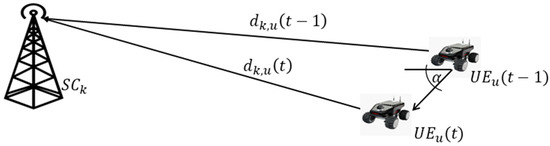 where , and are the x-axis, y-axis, and direction of UE at time slot. The distance traveled by within can be illustrated by