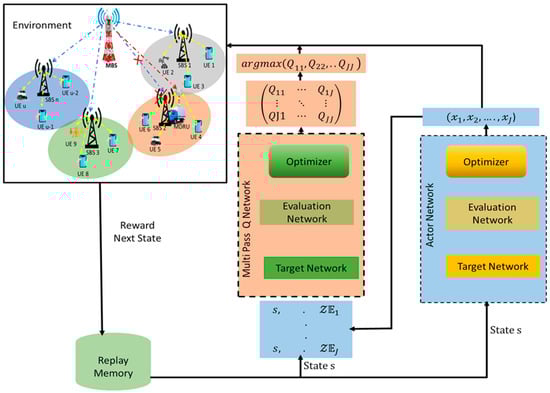 In [29], authors investigated a combined strategy for power allocation, which is considered continuous action and user association that is discrete action to improve downlink energy efficiency while ensuring QoS of stationary UEs under standard backhaul connection in HetNet by implementing the hybrid action space-based DRL called P-DQN. Furthermore, the architecture of P-DQN is similar to DDPG. However, discrete action is produced from the Q network, while continuous action is generated from the actor network. In P-DQN, the joint action parameter vector for all whole actions at a one-time step is taken as the input of the Q network. As a result, the gradients concerning all action parameters are calculated, which generates false gradients. In [30], the authors developed MP-DQN (similar architecture as P-DQN) and tested it in well-known Robot Soccer Goal and Half Field Offense games. They forwarded the continuous action parameter with a standard basis vector to the Q-network. Consequently, it mitigated the effects of false gradients of P-DQN, converged the complex optimization problem, and outperformed P-DQN regarding data efficiency and converged policy performance [28,30]. After that, researchers are applying MP-DQN to solve hybrid action space-based optimization problems in various fields from robotics to communications. MP-DQN was implemented in the Golf simulator to find the best action that consisted of shot selection with height, spin, and speed [31]. In [32], the authors implemented MP-DQN to build a decision tree method for the imbalanced binary classification where the continuous attributes represented the discrete action, and the threshold values were continuous action. For intelligent traffic signal control development, MP-DQN was deployed in [33], considering selecting traffic lights (red, amber, and green) with on–off time intervals. In [34], the authors applied the MP-DQN in an actual robot setup to primitive action (translation, rotation, and insertion) with the end-effector velocity as well as the contact force limits. In wireless communication, MP-DQN has been implemented for task scheduling of the Radio Access Network [35] and joint task offloading and resource allocation in the Non-orthogonal multiple access (NoMA) system [36].