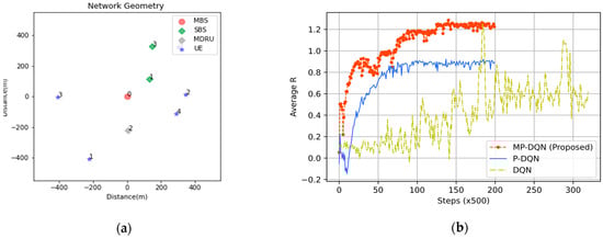 (a) Network geometry of HetNet based IoRT network and (b) Average reward (normalized) of proposed method (MP-DQN), P-DQN and DQN during the training session.