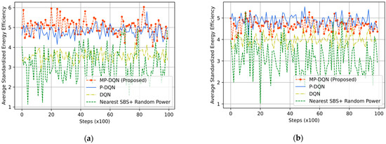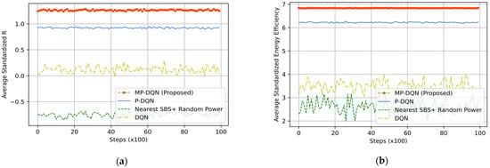 Average standardized energy efficiency based on (a) RFO and (b) RFT from proposed method (MP-DQN), P-DQN, and DQN and Nearest SBS + random power.