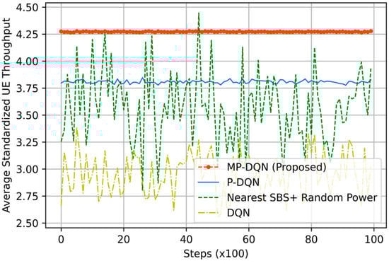 We compare the average normalized test results of our proposed MP-DQN method with P-DQN, DQN, and Nearest SBS+ Random Power in Figure 6a,b and Figure 7 by considering the total time steps with 100 realizations. In Figure 6a, the average standardized test reward has been shown for all methods where maximum average results (around 1.26) for all timesteps are generated by our proposed method MP-DQN. The second height test reward is produced from P-DQN while the nearest SBS with random power for the UE method gives the worst results. In addition, the average normalized energy efficiency for test sessions has been depicted in Figure 6b for all discussed methods. The energy efficiency of our proposed method is approximately 9.89%, 94.7%, and 160.44% better than P-DQN, traditional DQN, and distance-based association methods, respectively during the whole test period. In addition, the average UE throughput by the normalized process has been illustrated in Figure 7 for all methods. According to Figure 7, the average normalized system throughput of our proposed method MP-DQN is approximately 4.27 which is 12.36%, 44.74%, and 19.607% better results compared to P-DQN, DQN, and the nearest distance with random power allocation algorithms. The summary of test results for all methods including the proposed method is presented in Table 4.