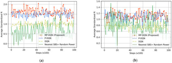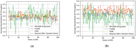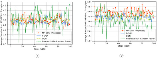 Due to its ability to remember previous activities, the GM mobility model is not stateless. It is appropriate for moveable UEs such as robots, cars, UGV, etc. We have illustrated average standardized reward, emergency efficiency, UE throughput, and SBS/MDRU throughput in Figure 8, Figure 9, Figure 10 and Figure 11, respectively. In addition, simulation results based on RFO and RFT have been illustrated in Figure Xa and Figure Xb, respectively, where X is within 8 to 11. Each UE’s average velocity has been considered 10 km/h with a random direction. In Figure 8a, the average standardized rewards mean is 0.6, 0.98, 1.48, and 1.61 from Nearest SBS + random power, DQN, PDQN, and MPDQN, respectively, based on the RFO. When the simulation is run with the RFT, the MPDQN generates (mean) 1.12, while PDQN and DQN produce 1.08 and 0.74, respectively illustrated in Figure 8b. Average standardized emergency efficiencies for all algorithms have been illustrated in Figure 9a,b according to RFO and RFT, respectively. In Figure 9a, MPDQN gives 5.03 while PDQN, DQN, and Nearest SBS + random power produce 4.81, 3.52, and 3.13, respectively. Furthermore, the MPDQN and PDQN generate almost similar energy efficiency that is better than the DQN and Nearest SBS + random power illustrated in Figure 9b.