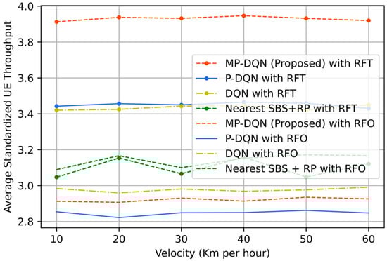 In Figure 12, the mean of average standardized UE throughput has been presented concerning the velocity range from 10 Km/h to 60 Km/h. With RFO, the average standardized UE throughput means approximately 3.10, 2.95, 2.92, and 2.84 from Nearest SBS + random power, DQN, MPDQN, and PDQN, respectively for all velocities until 60 Km/hour. In contrast, those are around 3.10, 3.40, 3.44, and 3.93 for Nearest SBS + random power, DQN, PDQN, and MPDQN, respectively, when adopting the RFT. The results are varied for the Nearest SBS + random power method due to the random power allocations. In our simulations, the discrete action (user association) selects the SC, and the continuous action allocates the power from SBS according to user association in every time step. As a result, the increment of velocity does not impact the simulation results. It is shown that the proposed method with the proposed reward function RFT gives a better result compared to others (Nearest SBS + random power, DQN, and PDQN).