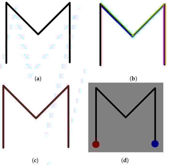 As a final procedure, the system determines where the shape tracing starts and where it ends. Note that this process differs for both open and closed shapes. In the previous example, the letter “M” is considered an open shape since it does not enclose an area and its lines do not connect back to their beginning. On the other hand, a closed shape refers to a shape that forms a complete loop or enclosure, such as a triangle. Subsequently, if the input image contains a closed shape, then the starting point matches the end point, creating a loop. Additionally, in the case of an open shape, the algorithm considers the bottom leftmost point as the start and the bottom rightmost point as the end of the tracing procedure, as shown in Figure 2d.