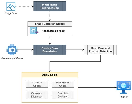 Our system’s development can be divided into four essential segments: an input shape detection algorithm, the creation and modeling of the virtual environment, tracking the patient’s hand, and finally the application of the exercise’s necessary operational logic.