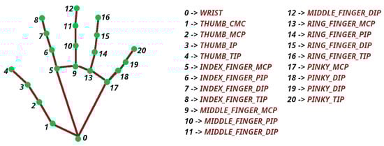 - Zhang, F.; Bazarevsky, V.; Vakunov, A.; Tkachenka, A.; Sung, G.; Chang, C.L.; Grundmann, M. MediaPipe Hands: On-device Real-time Hand Tracking. arXiv 2020, arXiv:2006.10214. [Google Scholar]