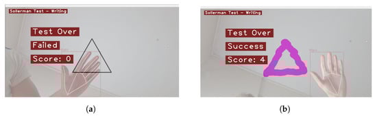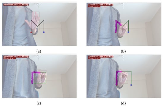An example demonstration of the CV-SWT is illustrated in Figure 5. Figure 5a displays the idle state, where the test has not yet been initiated and only the hand detector is being applied on the frame. Figure 5b presents the test’s running state, where the patient is instructed to replicate the letter “M”. Furthermore, Figure 5c,d display different shapes, namely a rectangle and the Greek capital letter , respectively. Furthermore, the drawing point radius is set to its lowest possible value, which is 20 pixels. This makes the test more challenging while also improving its representation of the real-world scenario. If the patient is unable to successfully complete the test, the drawing point radius can be augmented to a maximum of 40 pixels, thereby facilitating a less demanding overall procedure.