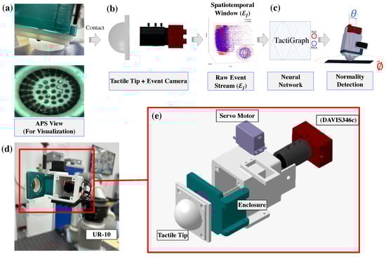 Proposed framework. (a) The neuromorphic vision-based tactile sensor makes contact with the surface causing the tip of the sensor to deform. Markers placed on the inner surface of the tip are displaced due to the deformation of the sensor. This can be seen in the active-pixel sensor (APS) view. This is shown for visualization only and is not used in any further processing. (b) The displacement of the markers is captured by an event-based camera, hence generating a continuous stream of events. A volume of events is used to construct a graph . (c) This graph is processed by TactiGraph, a graph neural network that predicts the contact angle of the sensor. (d) The full sensor with the hatch open. The markers on the inner wall of the tactile tip can be seen. (e) The proposed sensor configuration comprises four main parts: the deformable tactile tip, an event-based camera, a single servo motor to open and close the hatch, and an enclosure holding the camera.