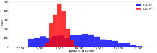 where the timestamp at which the contact case starts and is the window size chosen to be, at most, . The window size is adaptive to adjust for various depths of contact cases; a heavy contact case takes more time than a light contact.Figure 2 shows histograms of the number of events generated by contact cases in both LED-on and LED-off scenarios. Specifically, for each contact case, the event volume () was acquired at the specified contact angle, assigned by and . Additionally, each contact case (represented by a pair of (, )) was repeated 12 times at random depths, as explained in Section 2.1. The variance in the depth of the contact translates itself into the variance of the number of events generated; a light contact case will cause a smaller displacement to the markers hence generating fewer events and vice versa. When comparing LED-on and LED-off histograms, it was observed that (I) on average, LED-on contact cases triggered more events than LED-off contact cases, and (II) the variance in the number of events for LED-off contact cases was lower than for LED-on contact cases. The reduced contrast between markers and the sensor when the LED is off results in fewer events generated by the camera. Additionally, dark scenes contribute to significant background noise [75,76]. While various denoising methods are proposed in the literature [66,75,76], we employ the background activity filter with a 1.25-ms time window when the LED strips are off.