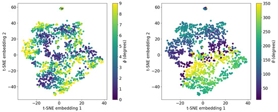 t-SNE embeddings of the activations of TactiGraph’s last layer before the MLP. Each point is the embedding of one graph corresponding to contact case. Left: colored by the angle of the contact case. Right: colored by the angle of the contact case.