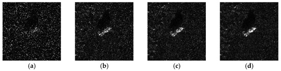where is the gamma function. It is obvious that the final measurement results obey the gamma distribution whose shape parameter and scale parameter are L and , respectively. When the pixel spacing is close to the radiation resolution, the SAR intensity data can be modeled in the multiplicative form [32,33], which can be shown as: