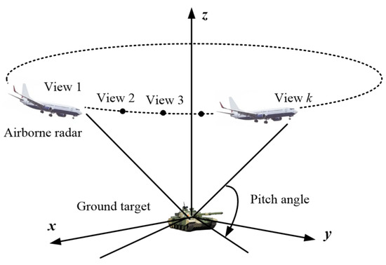 The performance of the SAR ATR in practical applications is affected by many factors, such as the battlefield environment, target characteristics, imaging parameters, etc. Here, the target characteristics of single-view SAR will fluctuate with the change of view. In addition, in SAR image processing, it is assumed that the target scattering characteristics remain unchanged during azimuth coherent accumulation, and that the scattering information related to the target viewing angle is lost in single-view SAR images. On the contrary, the multi-view SAR images of the same target contain more abundant classification and recognition information [34]. As a new way of information detection and perception, multi-view SAR target recognition technology obtains multiple images of targets from different perspectives based on the SAR platform. It uses the scattering characteristics of different perspectives to discriminate the category of targets, which has its unique advantages compared with single-view SAR target recognition [35,36]. The multi-view information collection of the same target is shown in Figure 2. Hence, in practice, it is a more reliable method to observe the same target from multiple views and obtain useful information.