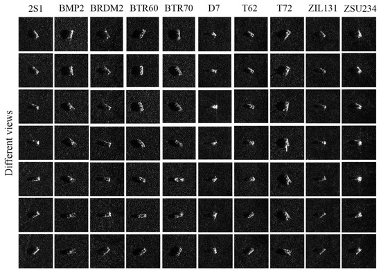 In this part, we use SAR images in the open MSTAR dataset to train the four classical models mentioned above. In the MSTAR dataset, according to different pitch angles, data quantities corresponding to 10 categories of targets are sorted out, respectively, as shown in Table 2. Here, the observation angle of each category of target varies from 0° to 180°. For the 10 categories of targets, imaging results under different view angles are presented, respectively, as shown in Figure 5. Consistent with the existing outcomes [44,45], SAR images with a pitch angle of 17° are taken as the training data. In the meantime, the four classical CNN models are trained by these images. Then, the pre-trained CNN models are taken as the experimental analysis object of this paper. Given this, it is analyzed whether the four classical pre-trained CNN models for SAR target recognition can effectively utilize these characteristics of the SAR image in this part, i.e., speckle noise and multi-view characteristics.