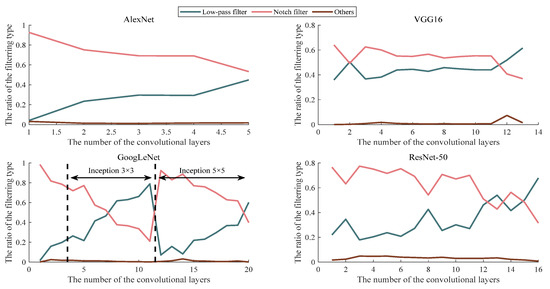 According to Figure 7, no matter how deep the number of convolution layers is, the convolution kernels in the convolution layer of the four classical CNN models belong to the low-pass filter or notch filter type in most cases. Moreover, the overall tendency is that with the deepening of the convolution layers, the proportion of the convolution kernels belonging to the notch-filter type gradually decreases, while the proportion of the low-pass filter increases. Especially in VGG16, GoogLeNet, and ResNet-50, the proportion of the low-pass filters in the deep convolution layers are higher than that of the notch filters. This phenomenon indicates that these pre-trained CNN models mainly extract the middle and high-frequency information in the low-level convolutional layer, which can be understood as extracting the contour information of a certain direction in the feature maps, respectively. In the deep convolution layers, the general information is extracted in the feature maps. This phenomenon corresponds to the size decrease of the SAR images and the reduction in target details in the feature maps after multi-layer processing. For the feature maps with less detailed information, the general features can be obtained by low-frequency filtering. It is more reasonable to take this as the key to the decision of some specific direction of the detailed information extraction again.