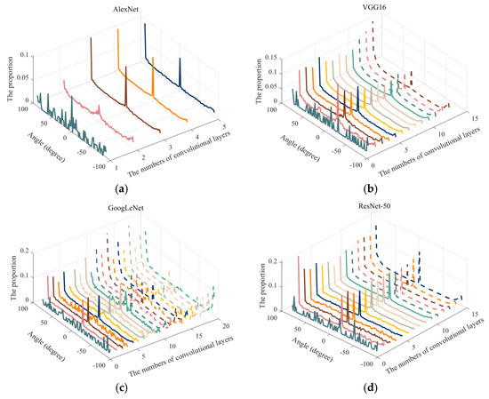The angle distribution of features extracted from convolution kernels of notch filter type: (a) AlexNet; (b) VGG16; (c) GoogLeNet; (d) ResNet-50.