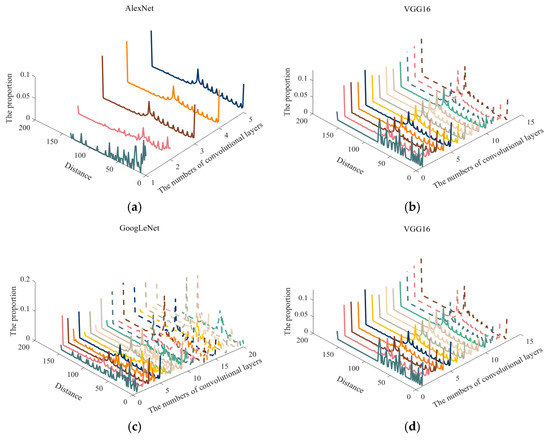 The distance distribution of features extracted from convolution kernels of notch filter type: (a) AlexNet; (b) VGG16; (c) GoogLeNet; (d) ResNet-50.