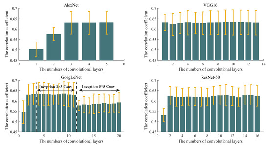 It is obvious that, compared with input image f(x, y), the reconstruction result has a different phase spectrum, but the amplitude spectrums are same. Hence, we can evaluate the phase spectrum role of convolution kernels by correlation coefficients between f(x, y) and fre(x, y). The bigger the correlation coefficients, the lighter the role of the phase spectrum. In Figure 10, we show the mean and variance of the correlation coefficient in different layers. The variation trend of the phase spectrum of the convolution kernel with the deepening of the convolution layer can be analyzed. It is obvious that in the first convolution layer of AlexNet, GoogLeNet, and ResNet-50, the phase spectrums of the convolution kernels play an important role. As described in Section 4.1, the phase spectrums of the convolution kernels have an obvious influence on the shape of the target in the raw input SAR image, which is also a manifestation of shape information extraction. However, VGG16 is the different one, whose correlation coefficient mean values are basically maintained around 0.63, indicating that the phase spectrum is not the main effect. In addition, the larger the variance, the wider the distribution range of the correlation coefficients. It can be seen that the distributions in the four pre-trained CNN models are relatively concentrated in the low convolutional layers, while there are obvious deviations in the high layers. This indicates that the phase spectrums of the convolution kernels have a similar effect in the low convolution layers, but the effect difference is obvious in the high convolution layers. This is because the processing object is very different from the raw SAR images in the high layers. For the feature maps with shape information, the feature extraction should be enhanced, while for the ones without shape information, the feature extraction can be ignored. The extraction of the shape information represents the role of the phase spectrums of the convolution kernels, which can qualitatively prove the rationality of the pre-trained CNN model.