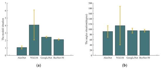 The same SAR image is input into four pre-trained CNN models to obtain feature vectors for input in the fully connected layer, respectively. Based on ignoring the nonlinear operation in the fully connected layer, the angles between the feature vectors and each column vector in the weight matrix of the fully connected layer are obtained, as well as the moduli of every column vector. The mean and variance are calculated, as shown in Figure 11. Although the mean of the modular value of the weight vector will directly affect the output value of the fully connected layer, the output of different target types is significantly different only when the variance is large. In the angle part, the variance value also affects the difference in output results for the different target types. Therefore, according to Figure 11, the pre-trained VGG16 model has the most obvious difference in the output of labels for different target types.