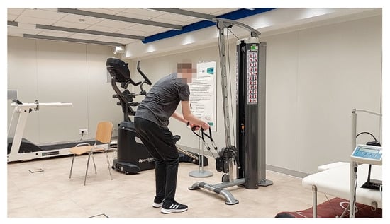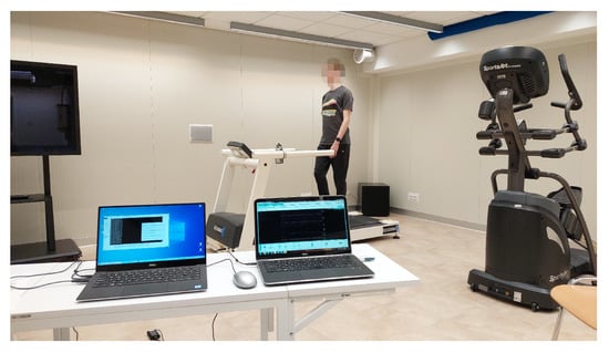 The data collection was carried out with the involvement of six volunteers, in controlled environmental conditions, in the Research and Demonstration Laboratory SMART PPE TESTLAB on the premises of CIOP-PIB. The study participants included three women and three men. The average age, height, and weight of the participants were 32.17 ± 6.11, (174.50 ± 10.99) cm, and (67.40 ± 11.73) kg, respectively. The tests were carried out in an environment with an ambient temperature of 25 °C and a relative humidity of 65%. The research procedure involved performing various physical activities, such as walking on a treadmill at 5 km/h and 3 km/h (Figure 2), as well as exercises using the upper lift (Figure 3). The exact test procedure is presented in Table 1. The test procedure was planned so as to include exercises involving hand movements to be able to analyze the impact of hand movement on the correctness of the smartwatch’s indications.