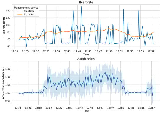 Figure 4 presents a fragment of the collected data with the three-axis acceleration data summarized as an overall acceleration magnitude. The errors in the measurements from the PineTime device are clearly visible, as are the differences between the activities performed (for instance, the subject was walking at 5 km/h between 12:36 and 12:51, took a break, and then started walking again at 12:56).