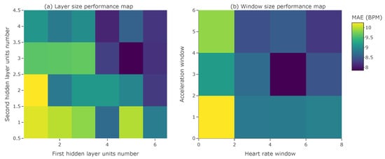 Due to the small target size of the final network, architecture tuning was performed to find the optimal number of additional hidden layers and the number of units in every hidden layer. The input data size (i.e., the sampling strategy) was also a part of the tuning procedure, aimed at finding the optimal window sizes for both the heart rate and the acceleration data. The following parameters were examined during tuning:
