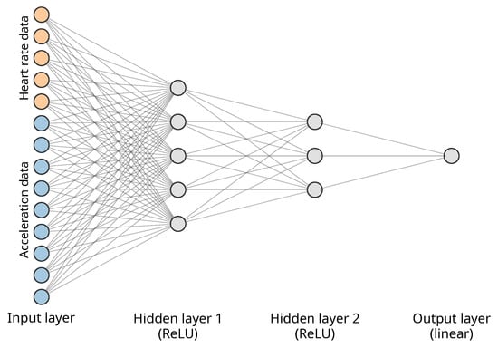 The final choice of parameters was dictated by the model size, as related to the best MAE. As a consequence, the best model has 97 parameters in total, with the first hidden layer having five units, and the second hidden layer having three units. A heart rate window of size 5 and an acceleration window of size 3 were also selected based on the defined selection multicriteria. The final model is presented in Figure 6. The model’s weights were published in Zenodo [47]. This final model was then used in the implementation in the smartwatch and the evaluation in Section 5.