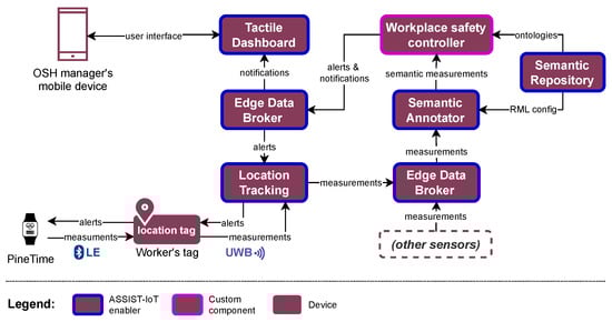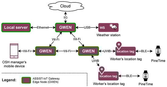 The smartwatch is only a single element of the overall architecture of the solution needed to deliver the use case. Figure 7 and Figure 8 present an overview of the hardware and software layers of the integrated solution that utilizes the ASSIST-IoT reference architecture [20]. Starting with the hardware layer, the smartwatch of each worker communicates via BLE with the worker’s location tag, which, in addition to tracking the worker’s location also serves as a wireless communication relay. The location tag connects to the nearest ASSIST-IoT Gateway Edge Node (GWEN) [20] via UWB. In this architecture, the GWENs are the main providers of compute capability, hosting the ASSIST-IoT enablers and other software components. They are connected to each other and a local server via Wi-Fi or Ethernet. The hardware diagram includes also a mobile device of the OSH manager. The manager uses it to monitor the safety of the construction site. Finally, the system includes a weather station, which collects environmental measurements that are used as context in the decision-making processes.
