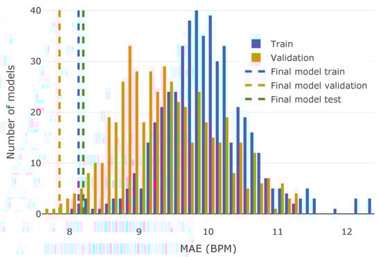 After choosing the final model, the test dataset was used to assess the performance of the model on previously unseen data (green dashed line in Figure 9). The test dataset does not have a respective histogram, due to its absence during the tuning stage; it was used exclusively for the final model performance estimation. The resulting test MAE is 8.19 BPM, while the train and validation MAEs are 7.85 and 8.12, respectively. The final model has a low error on all three datasets, and the maximum difference between the model’s performance on the train, validation, and test datasets is 0.34. This shows that the model’s performance on previously unseen data closely aligns with the performance observed during the model tuning phase. The final MAE of 8.19 BPM is also lower than the target MAE of 10 BPM, as required by the use case.