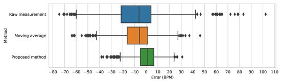 The errors of the raw measurement, the moving average, and the proposed method, in relation to the ground truth, on the test dataset. The boxes show the quartiles of the error distribution. The whiskers show the extent of the distribution, except the outliers, indicated with diamonds.