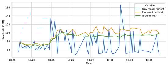 The final model was also compared on the test dataset against two baselines—the simple moving average, which takes the mean of the last five heart rate measurements, and the raw, unmodified measurement. In the comparison, MAE and MSE (mean squared error) metrics were used. The results are presented in Table 2, showing that the proposed approach is significantly better than the moving average baseline. Figure 10 shows the distribution of errors in the raw measurement, the moving average, and the proposed method. Additionally, Figure 11 presents an example prediction of the model, compared to the ground truth and the raw measurements.