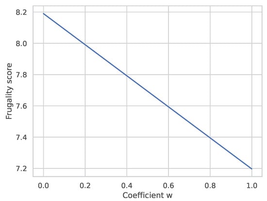Here, is the mean absolute error computed for the model on the test dataset. The values of the RAM usage and the CPU time are represented in bytes and milliseconds, respectively. The coefficient w expresses the importance of resource frugality in the final value of the score, with 0 indicating no resource scarcity and 1 indicating extremely scarce resources. The frugality score was plotted for different values of w (Figure 12), forming the frugality curve. The RAM and CPU time consumption used to compute the frugality curve were measured on the PineTime smartwatch. The case of RAM consumption includes only the memory used by the method. The curve can be used to compare the frugality score of the method described in this work with those of other methods. The scores may be analyzed for a given level of resource frugality needed for the problem indicated in the form of the w coefficient. The authors encourage modification of this frugality score and the reuse of the frugality curve for research purposes.